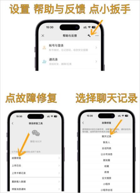 情况一:微信更新/系统更新,聊天记录突然没了步骤:【我】-【设置】-【帮助与反馈】-右上角的【扳手图标】-【故障修复】-【修复聊天记录】即可,这种方式只适合非人为、非硬件问题(内存内的数据丢失)导致的聊天记录消失,其他原因导致的问题无法修复。