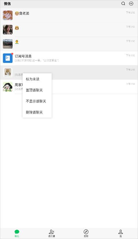1、不想在“微信”界面显示好友可以长按好友对话框,选择“不显示该聊天”就可以啦。