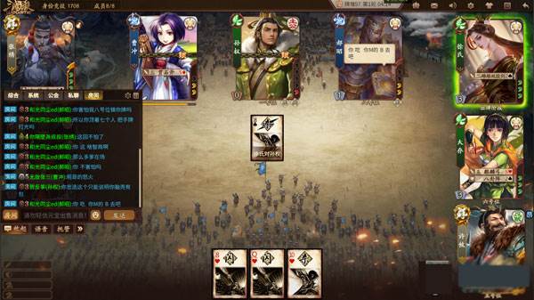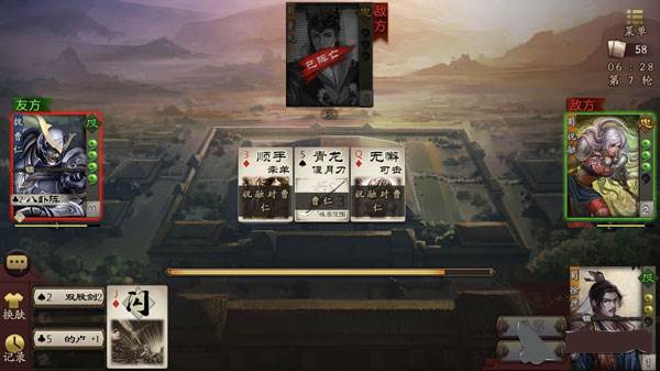 3、选择完角色之后,玩家获得系统随机给予的卡牌,通过卡牌的角逐来判定胜负。卡牌的数量一般分为几种,分别是锦囊、杀、闪以及血量回复,